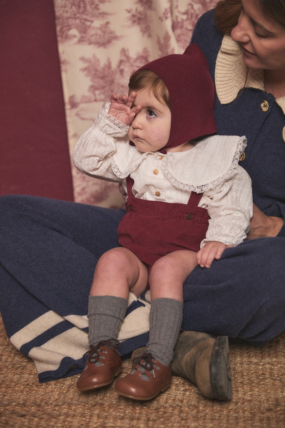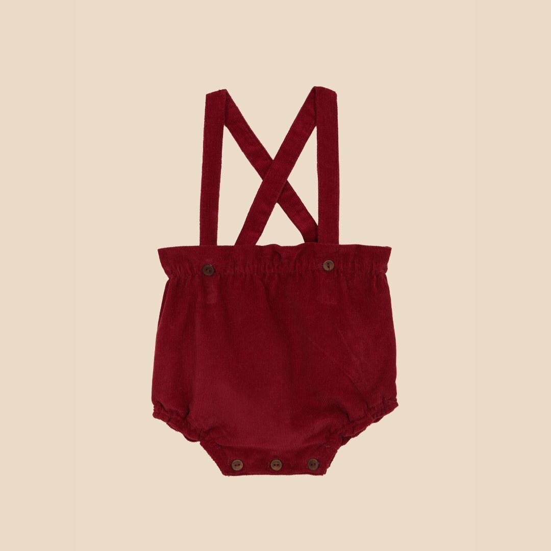 高級感のあるワインレッドのカラーと、秋冬らしいコーデュロイ素材で