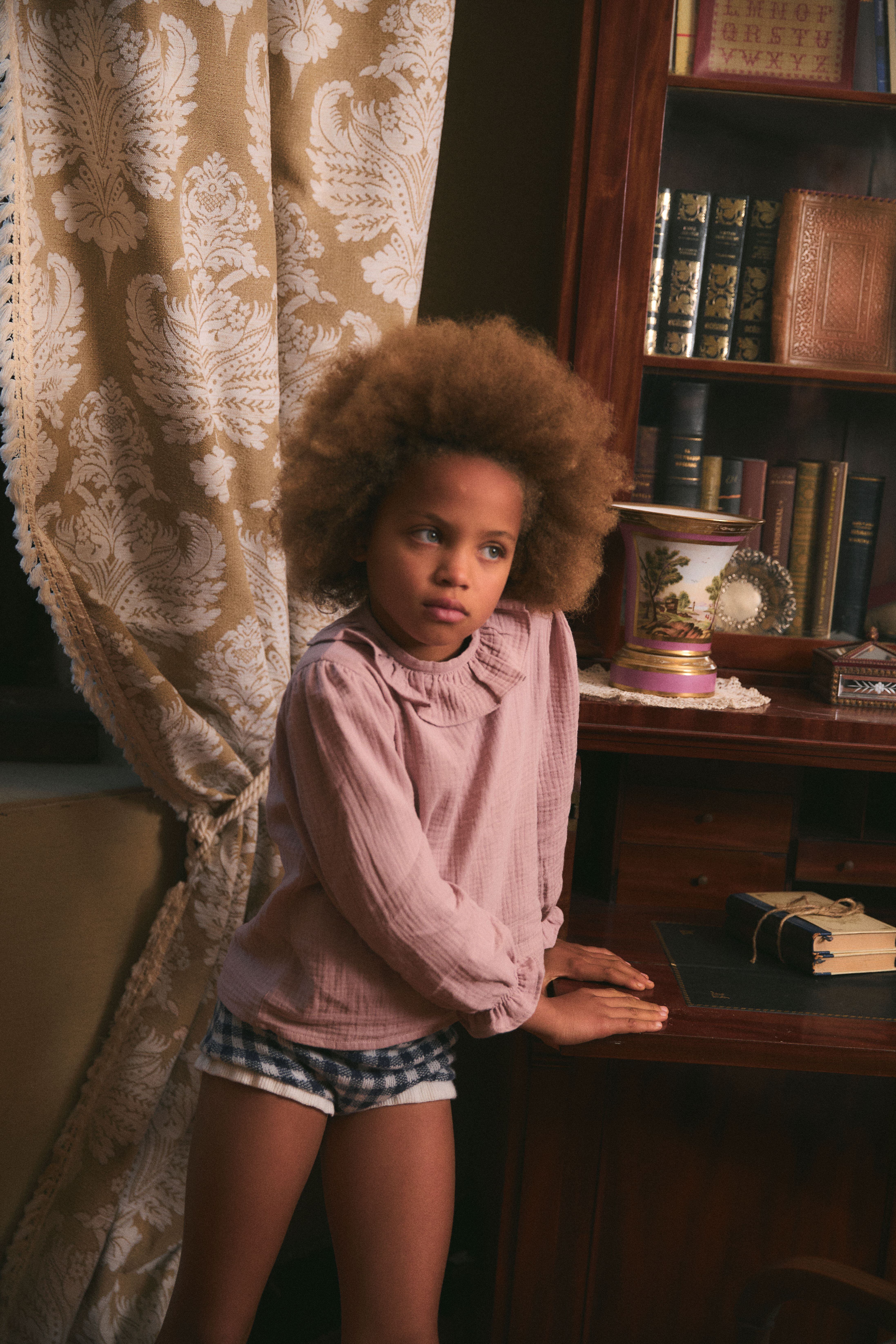 首元のフリルが可愛らしいサンドピンクのシャツ。