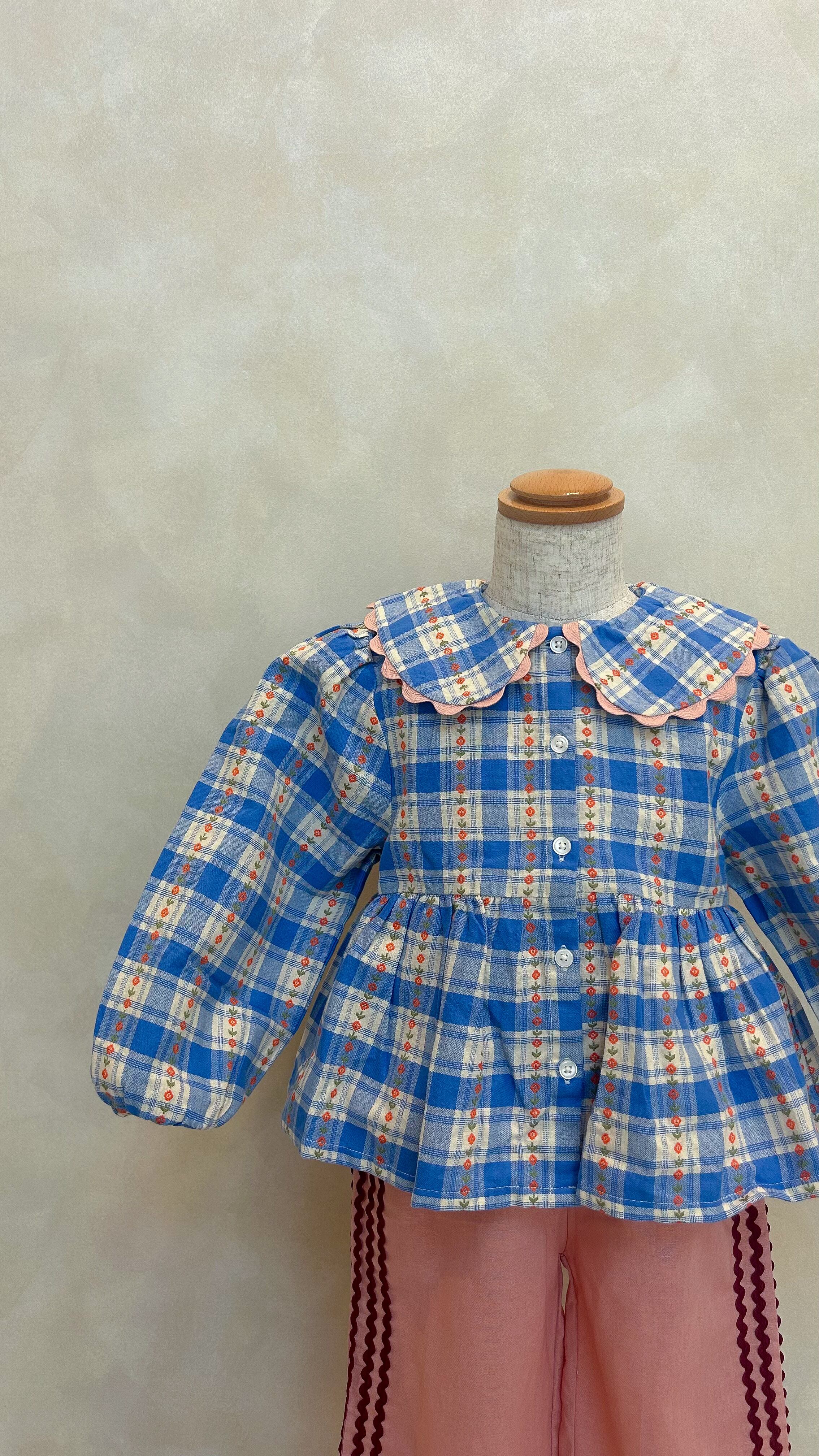 チェック柄に小さな花柄の刺繍が施されたブラウス。