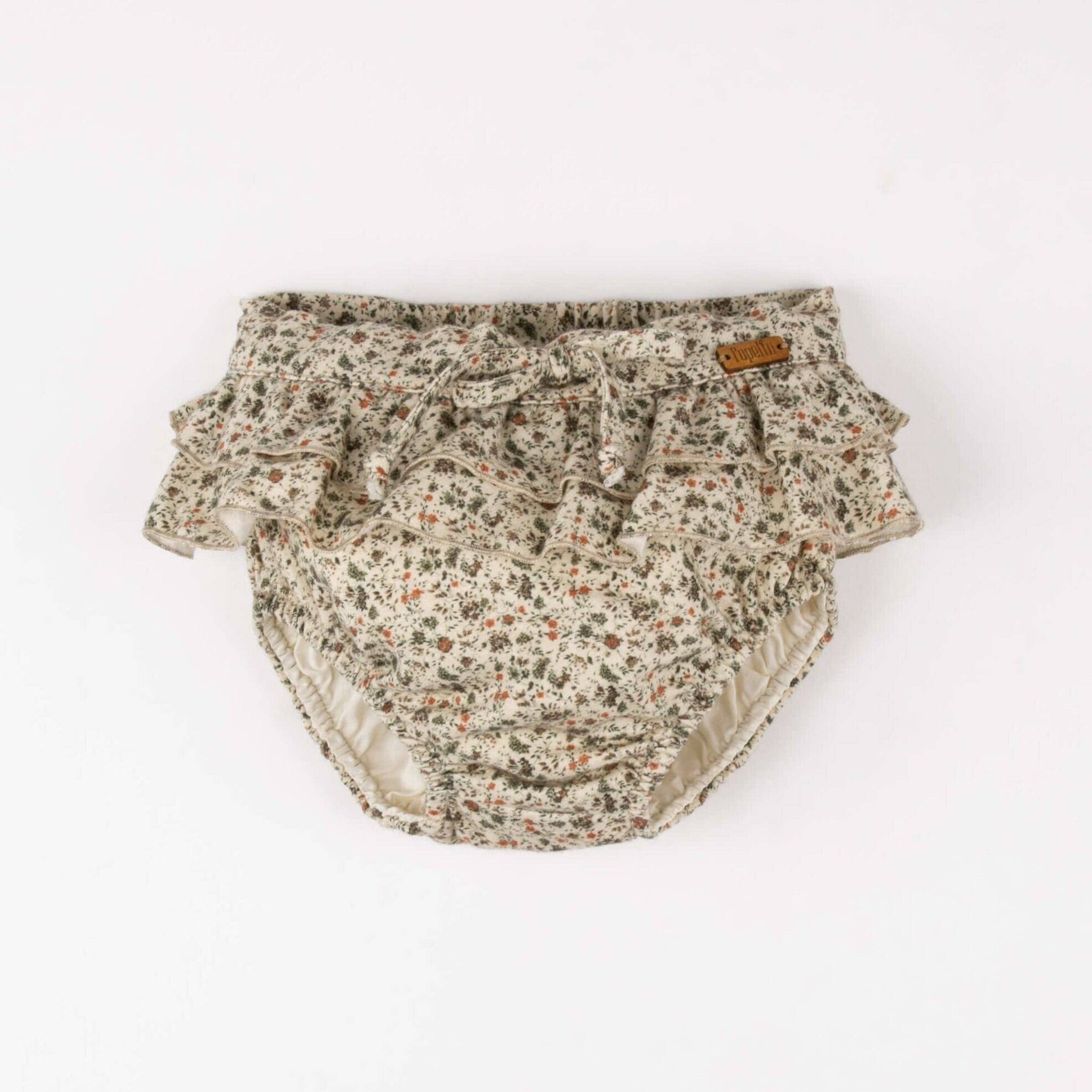 ダブルフリルと調整可能なドローストリングウエストのキュロット。