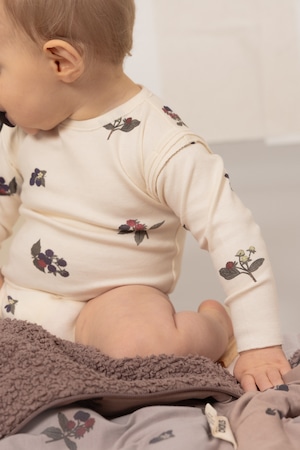 ブラックベリーモチーフの100%オーガニックピマコットン製の長袖ボディスーツ。