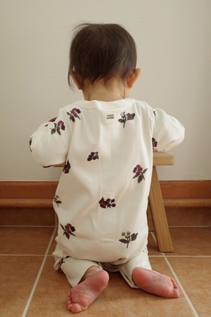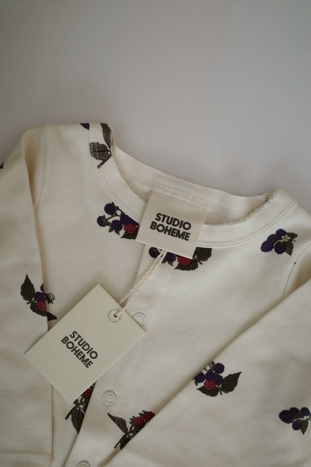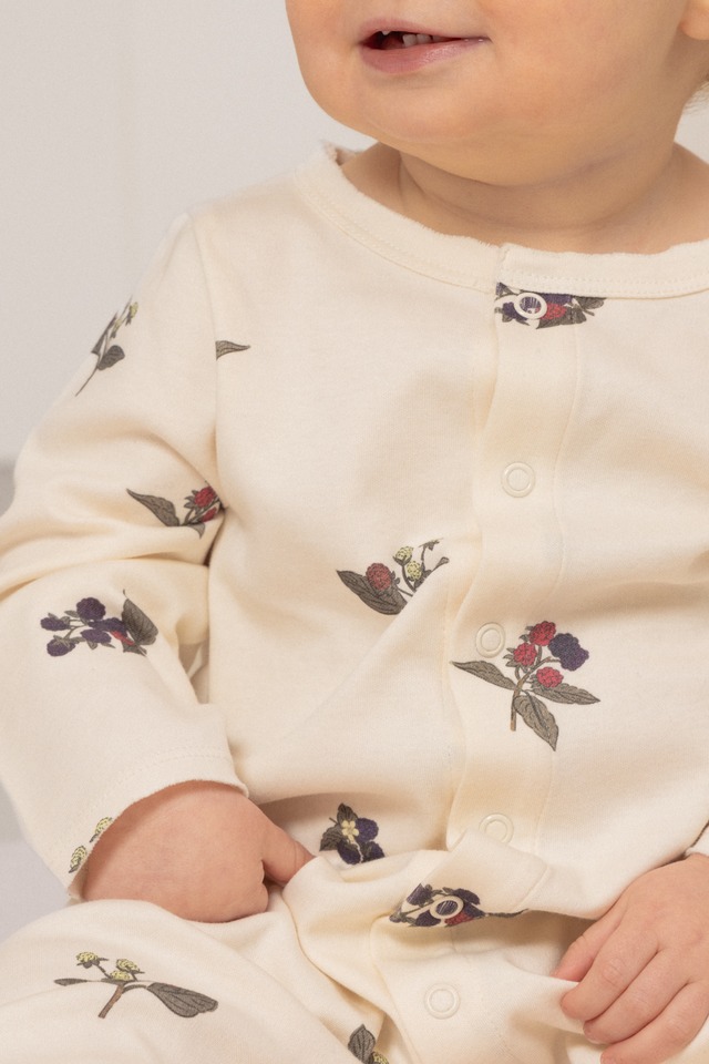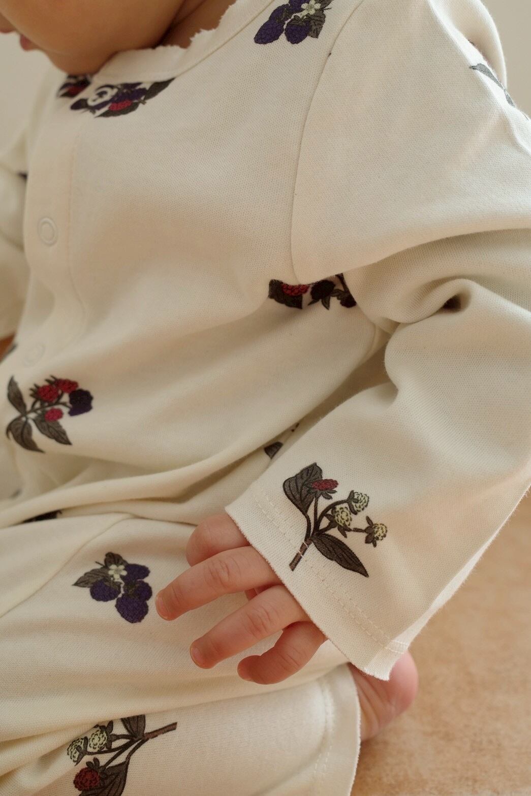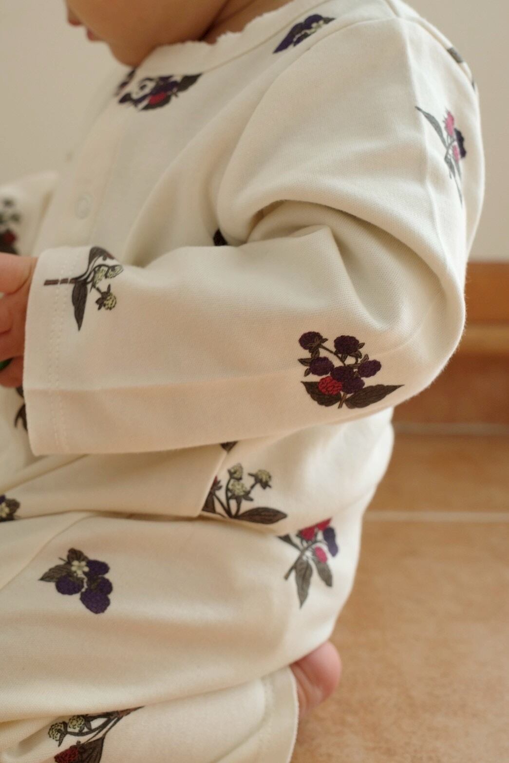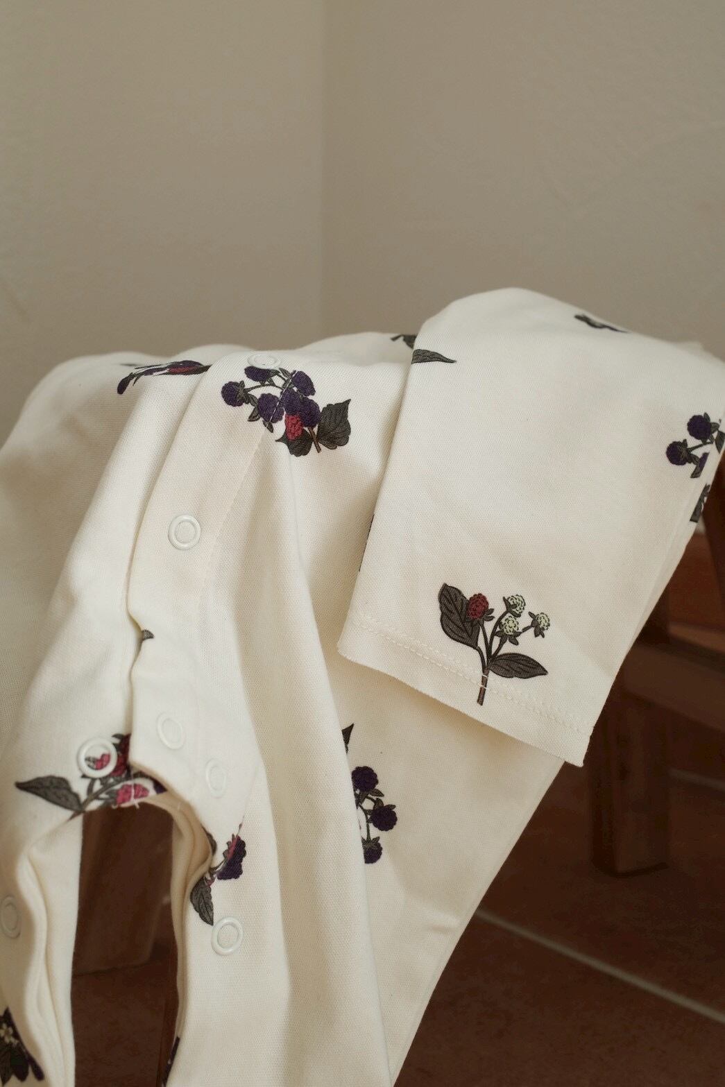 ブラックベリーモチーフの100%オーガニックピマコットン製長袖ジャンプスーツ。