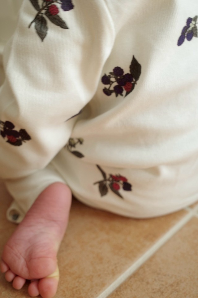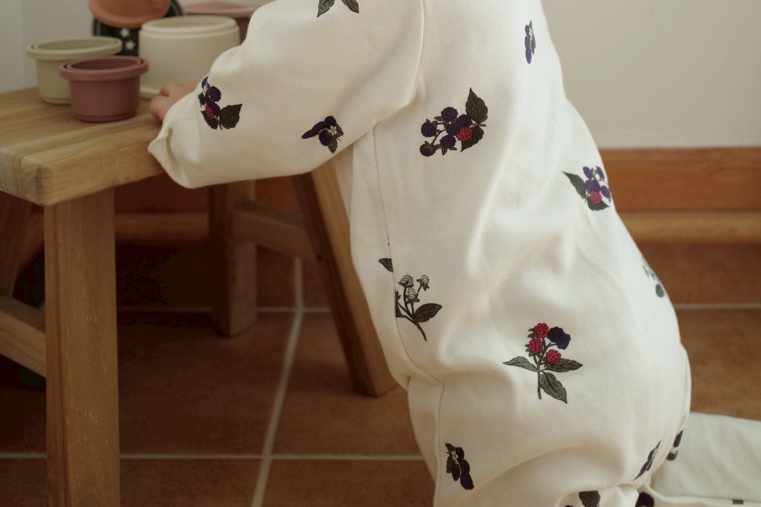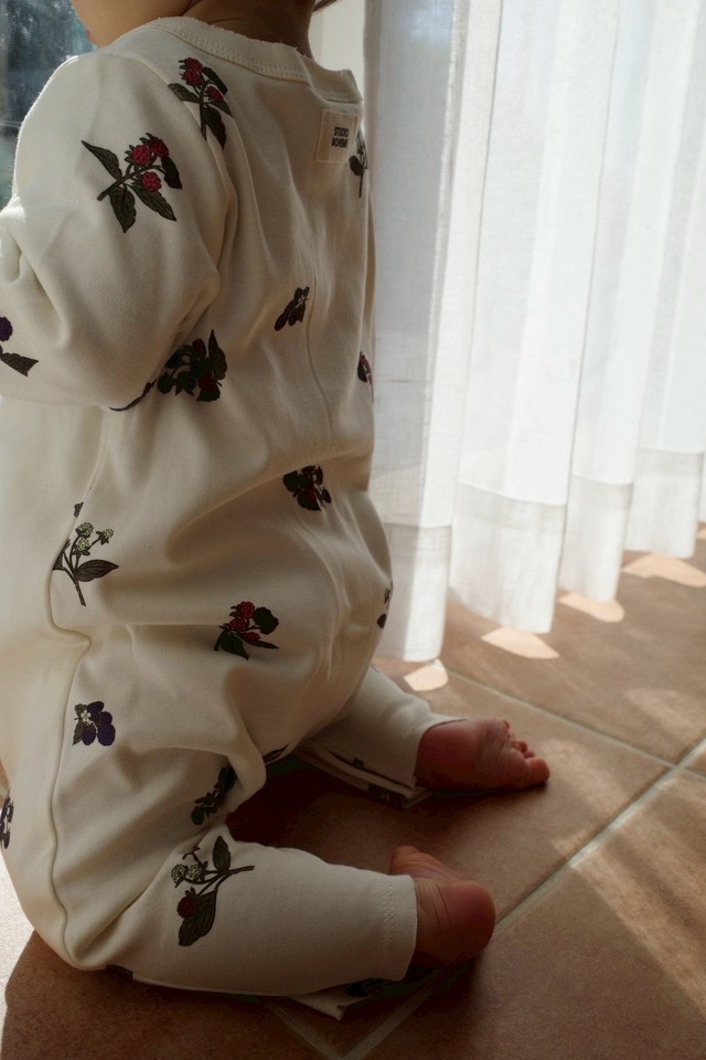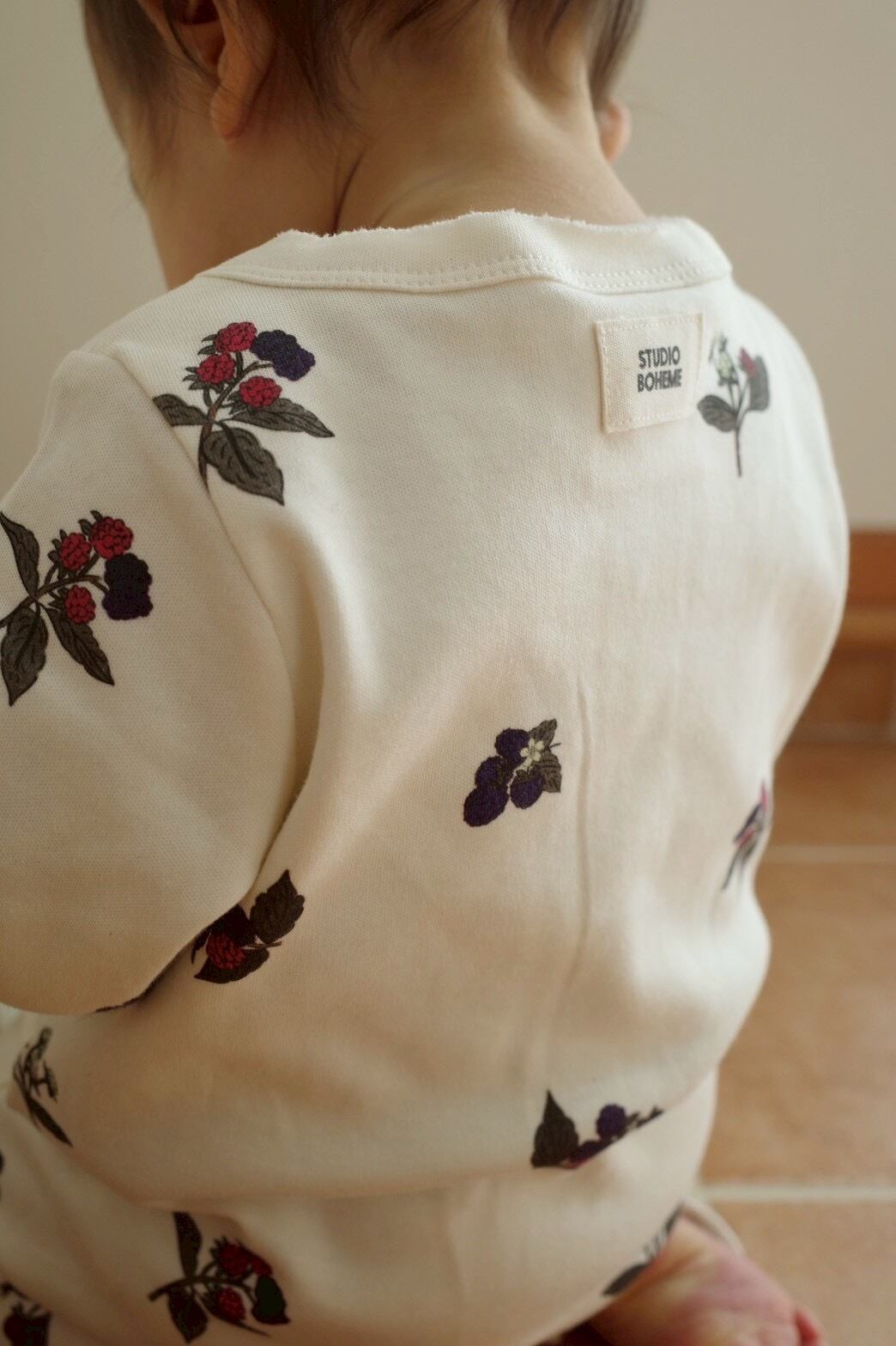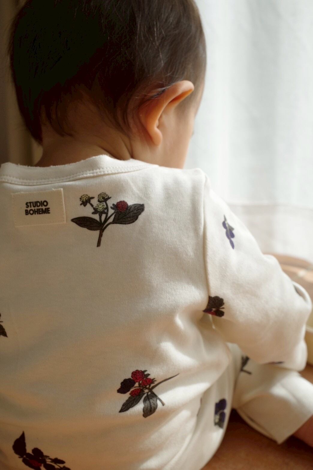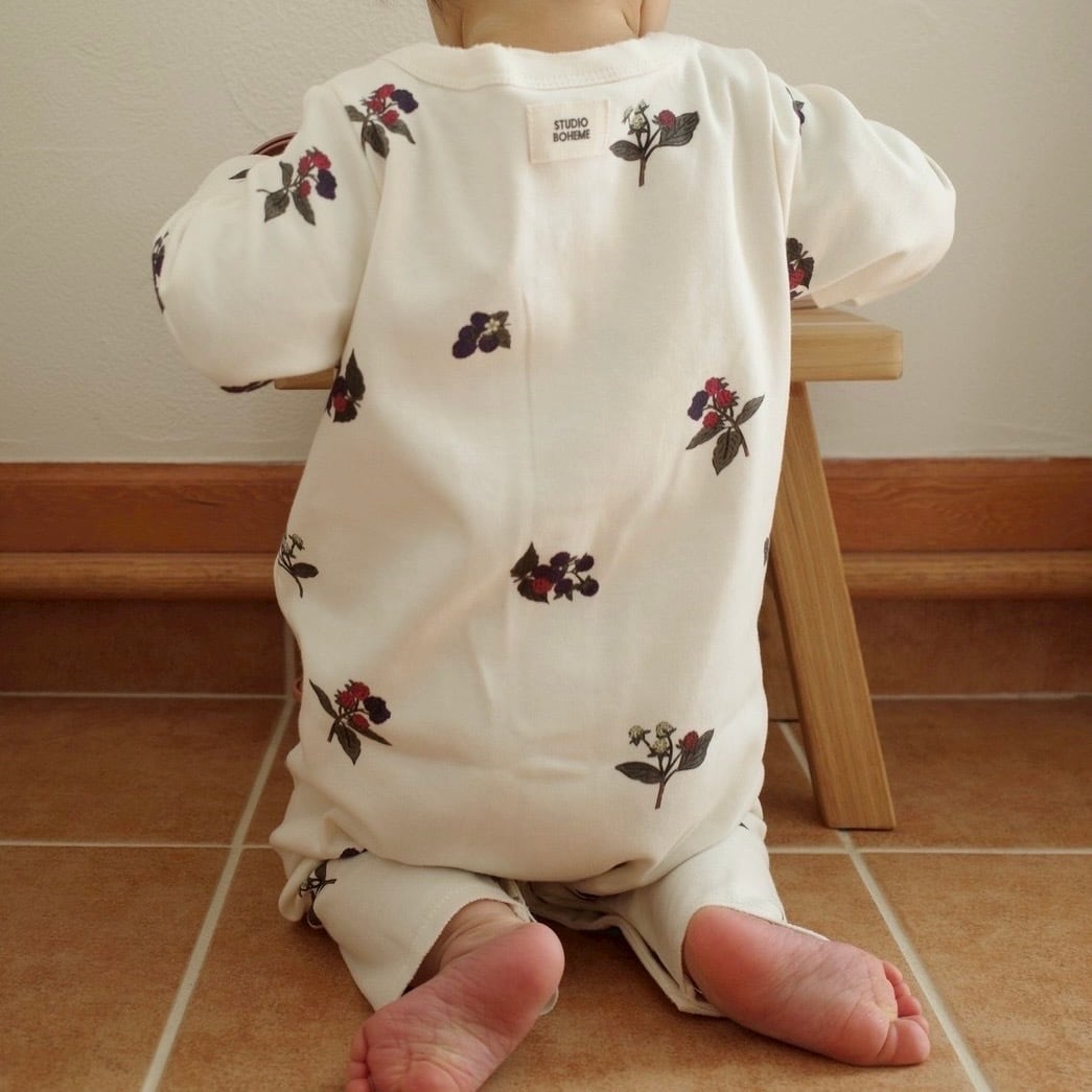 ブラックベリーモチーフの100%オーガニックピマコットン製長袖ジャンプスーツ。