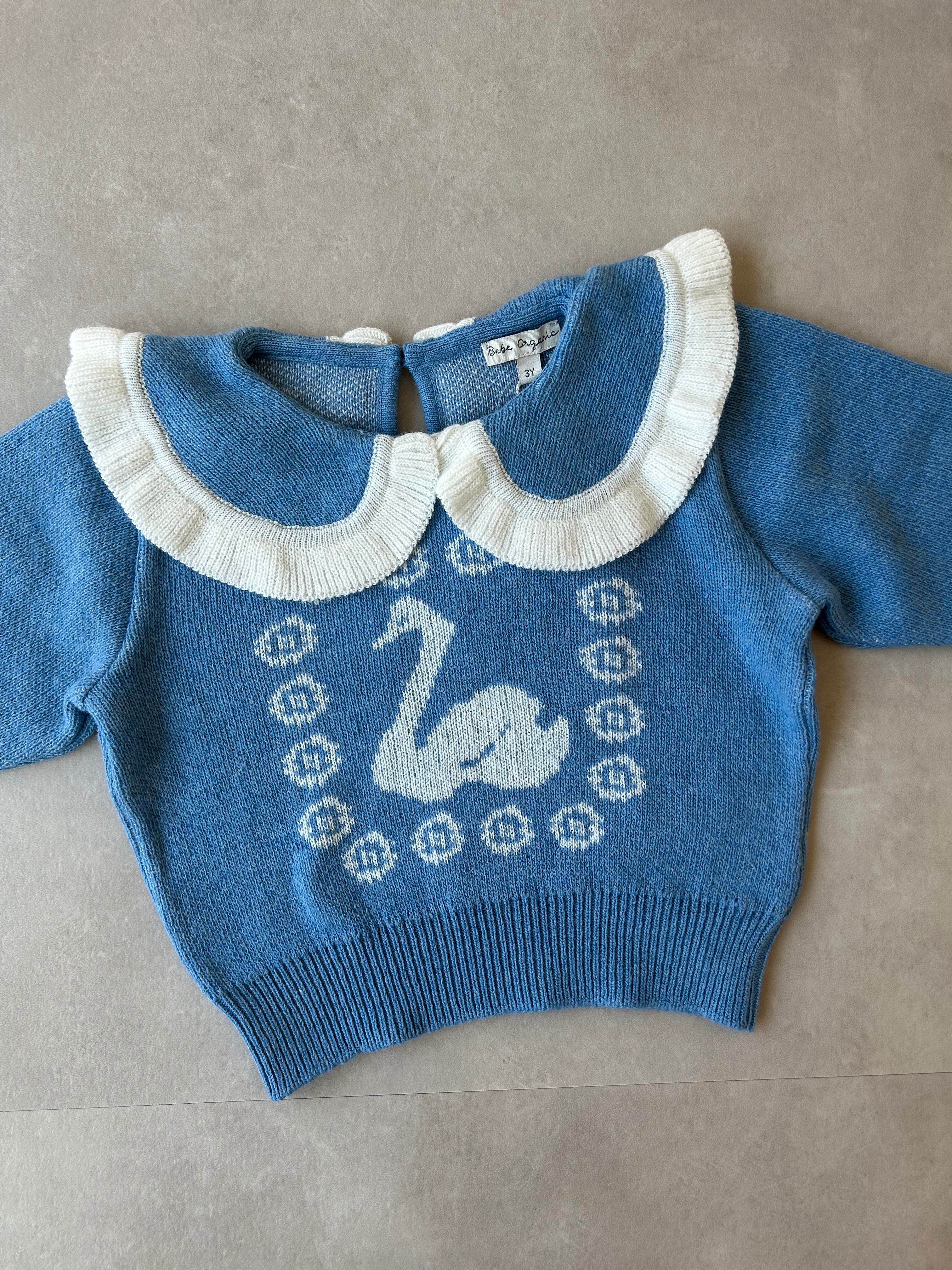 スカイブルー白鳥モチーフのニットセーターは、これからの秋シーズンにぴったりの一着。