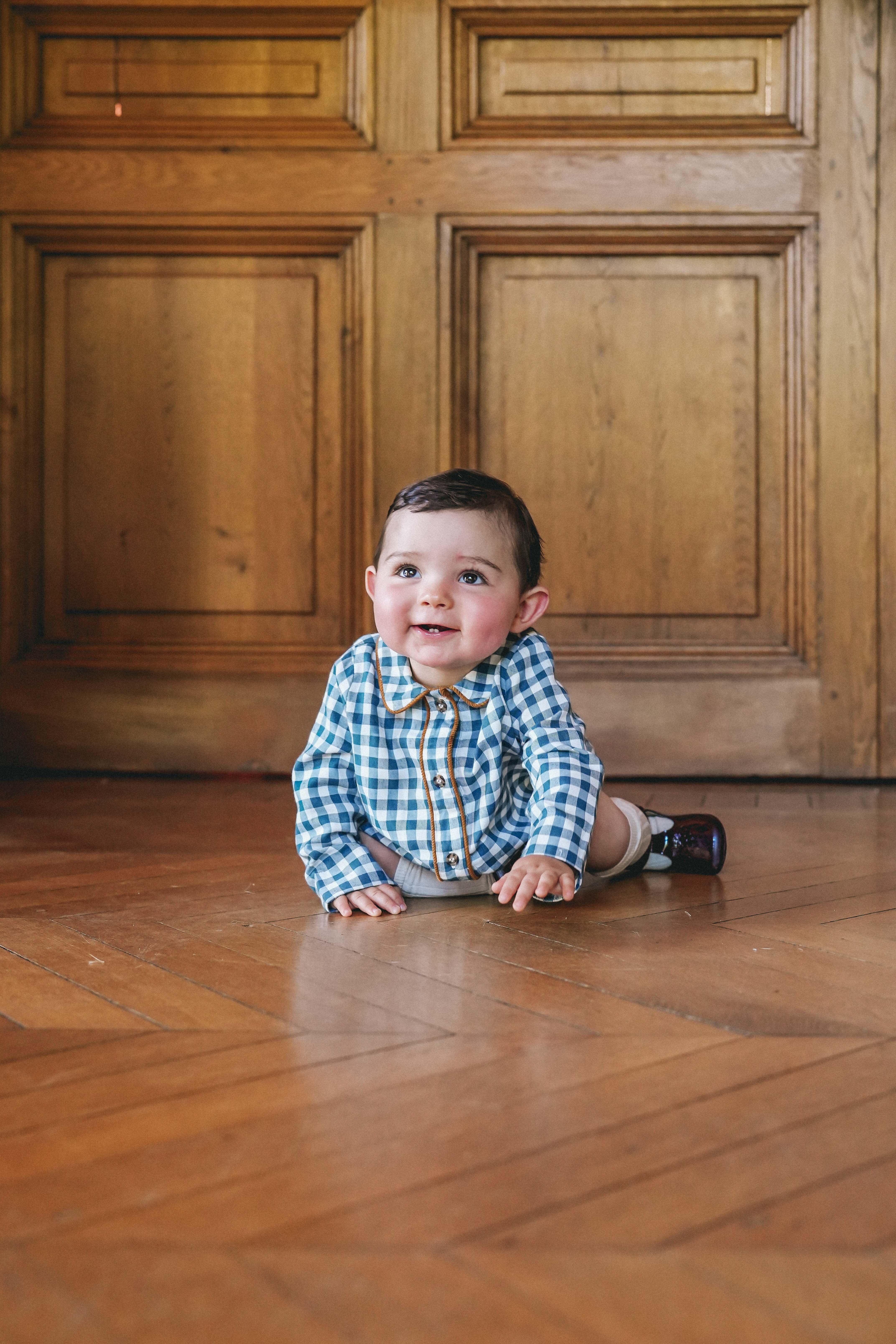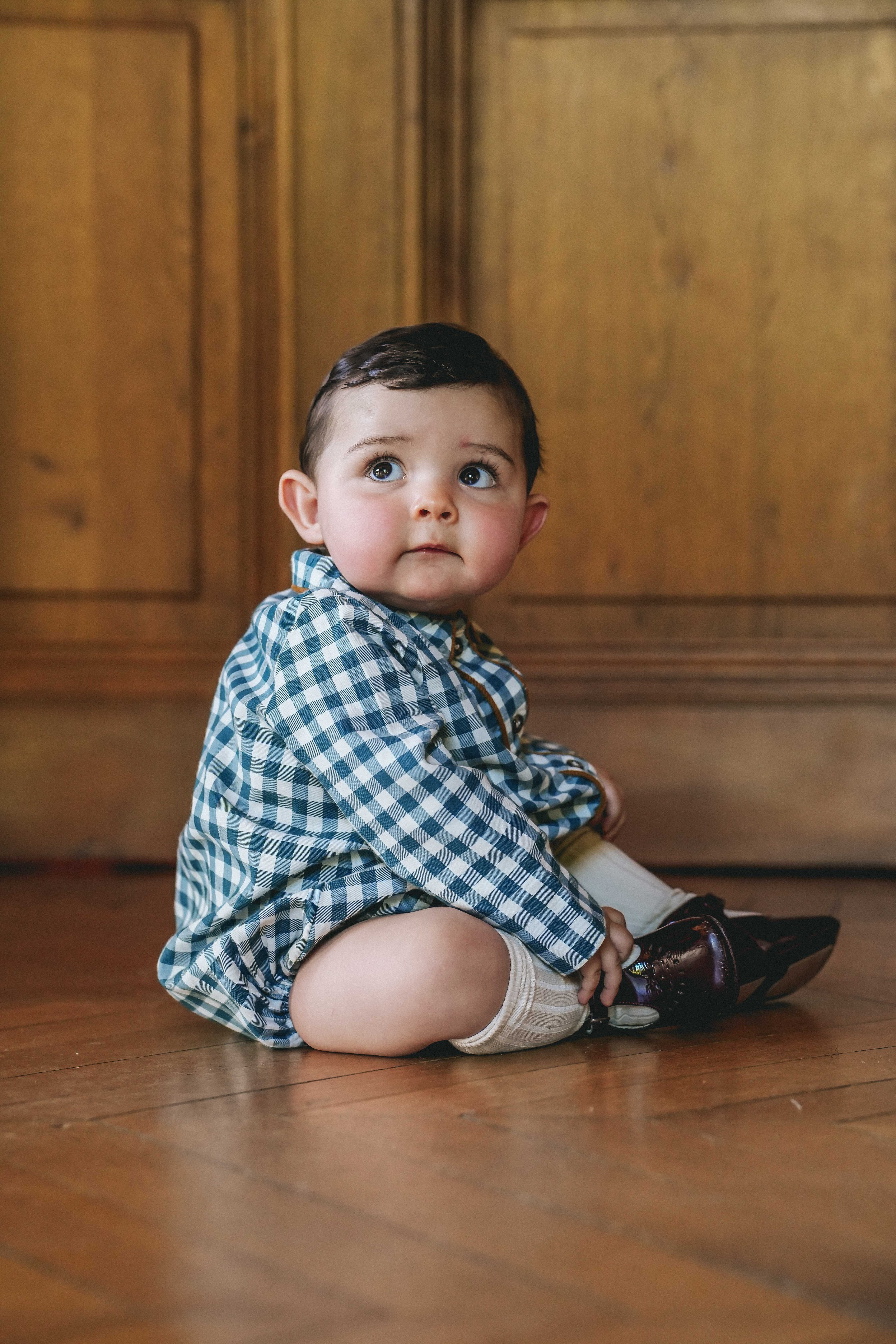 シンプルな襟と美しい縁取りが施されたボタン留めが特徴の、ユニセックスのロンパース。