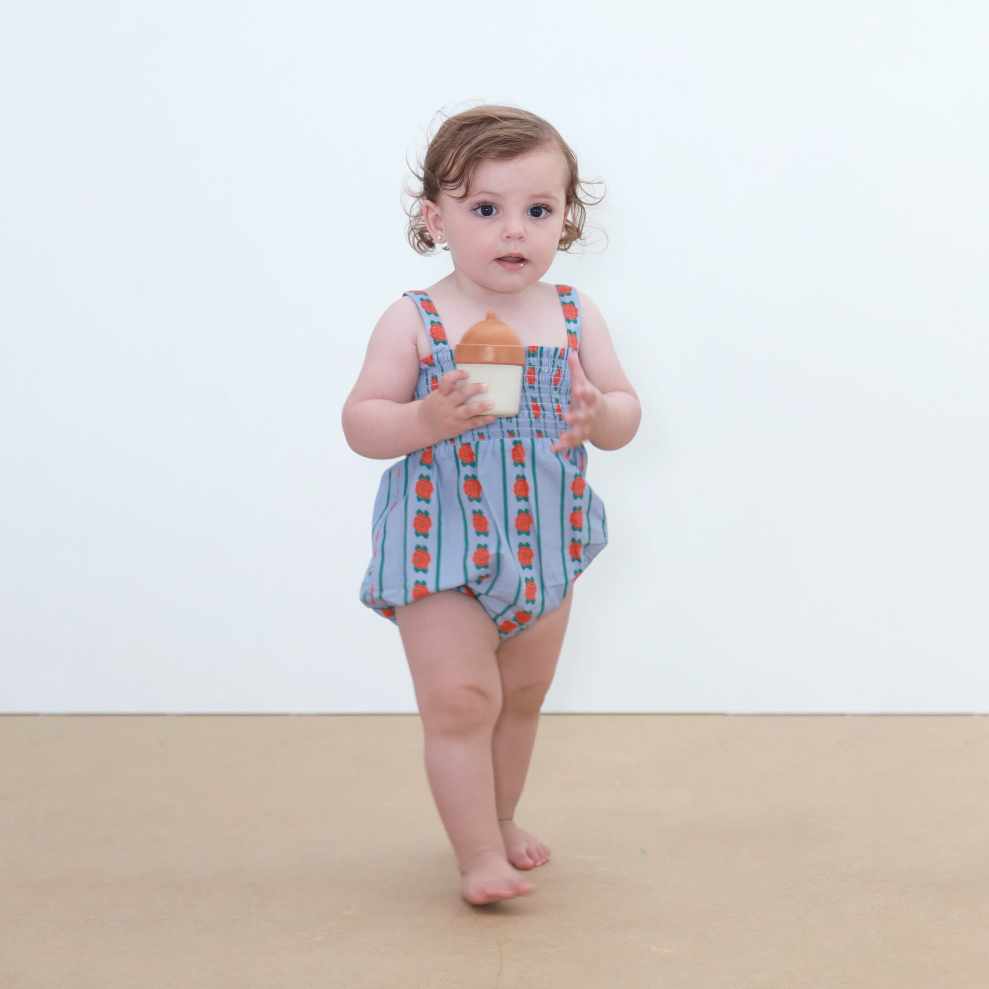 鮮やかなブルーにバラの柄が目を目を惹くロンパース。
