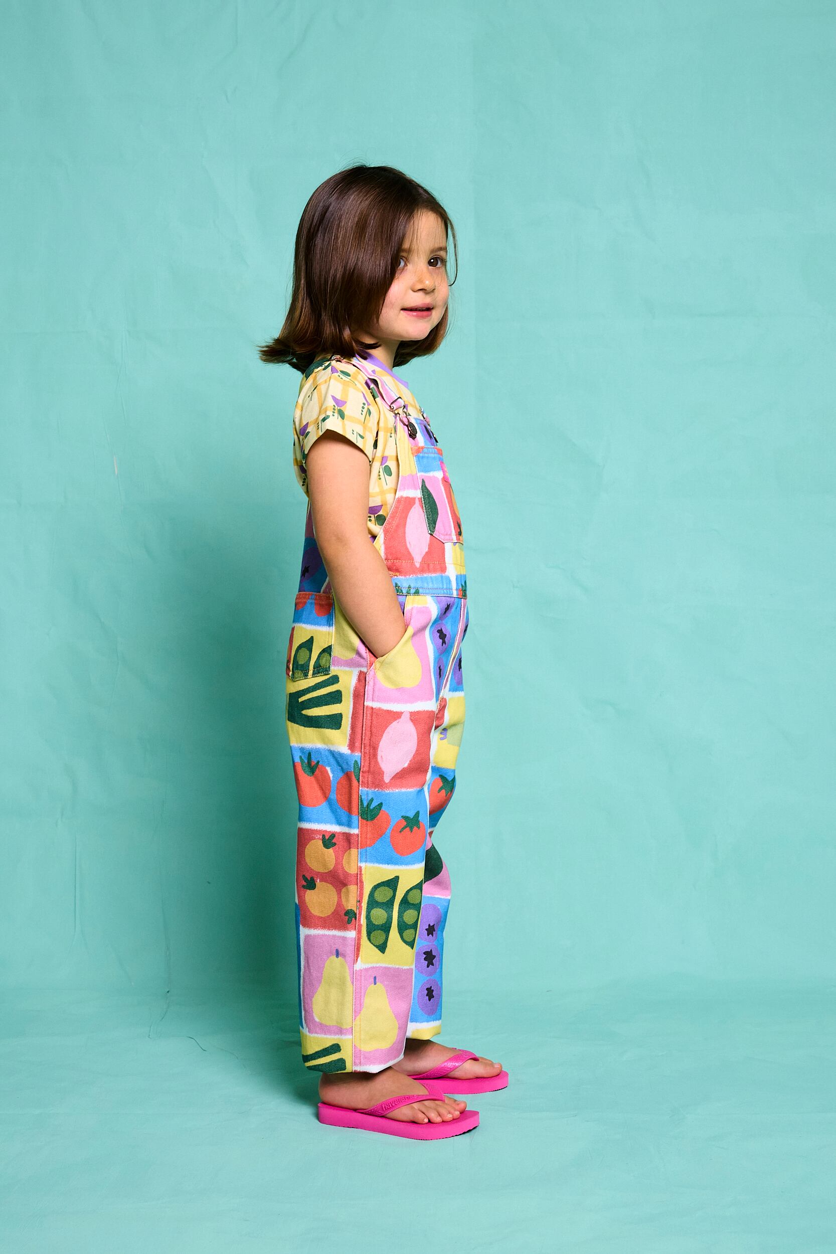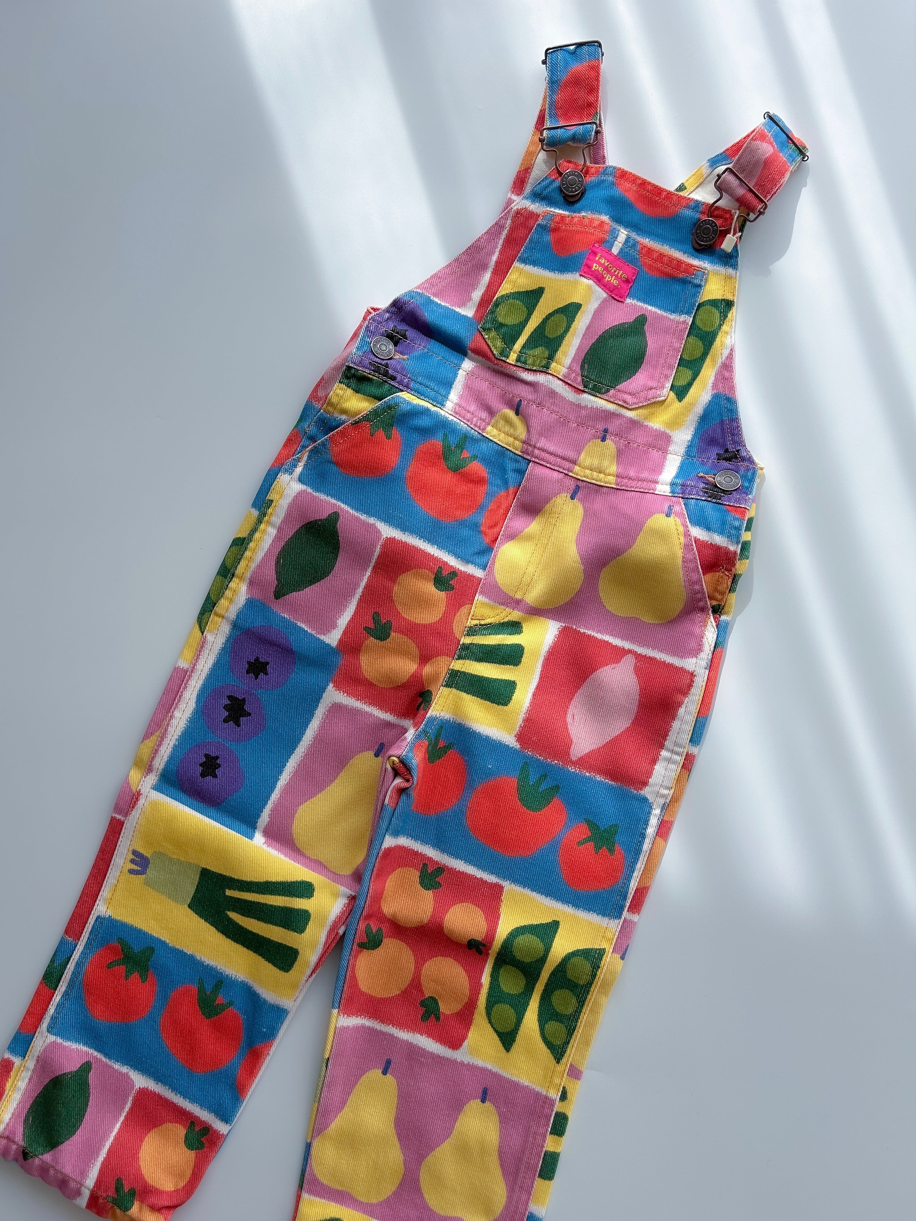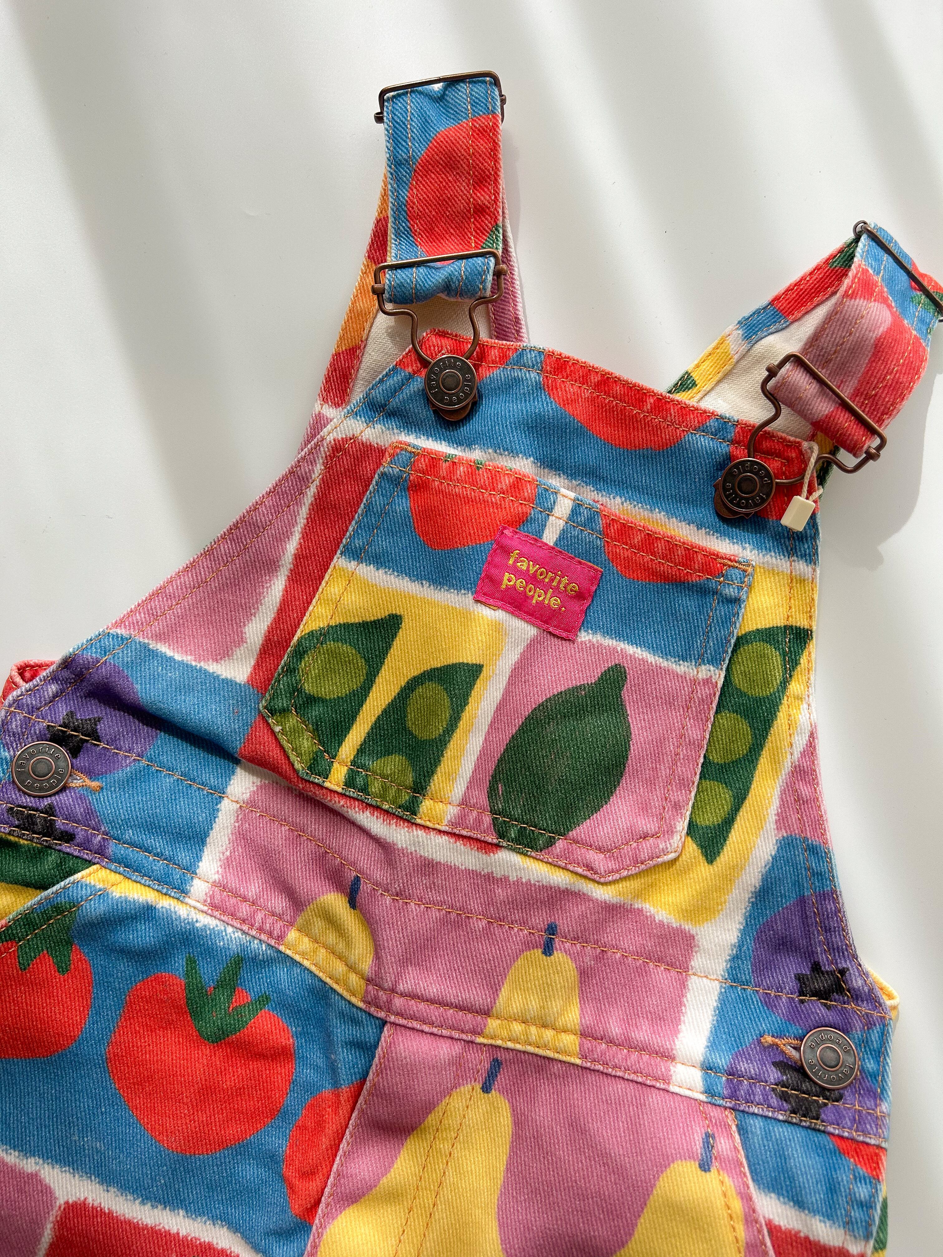 野菜やフルーツをモチーフにした明るく元気なデザインのオーバーオール。