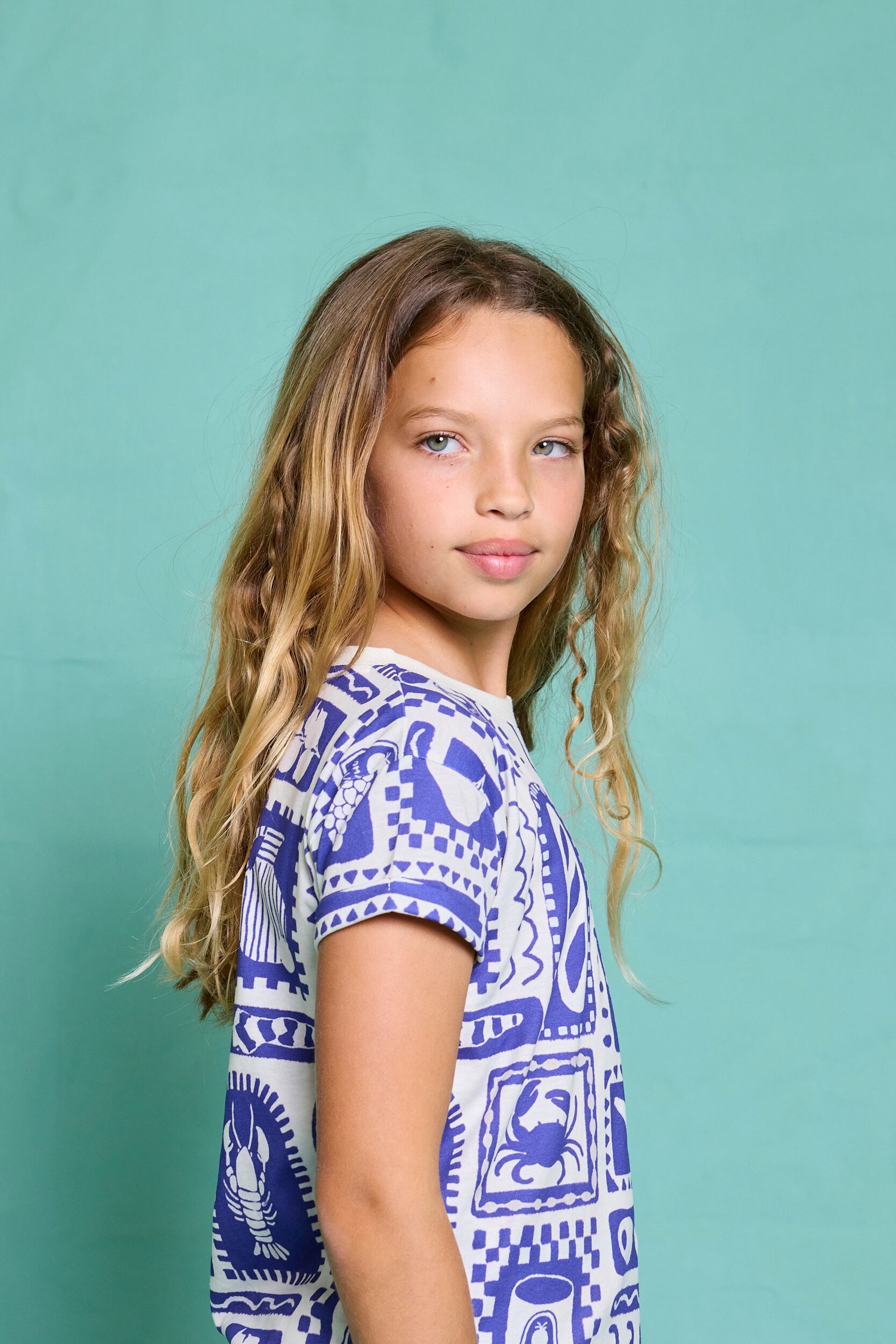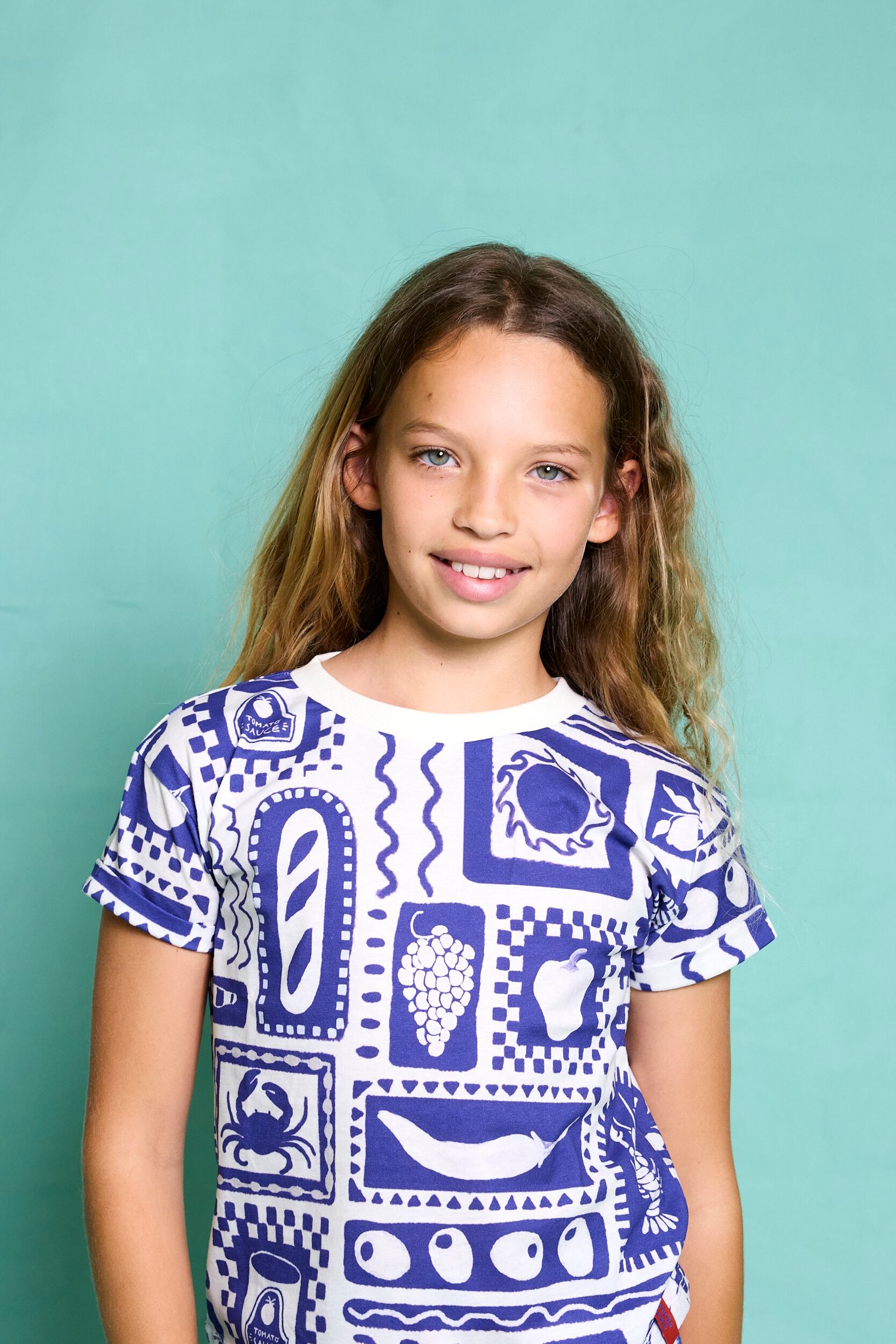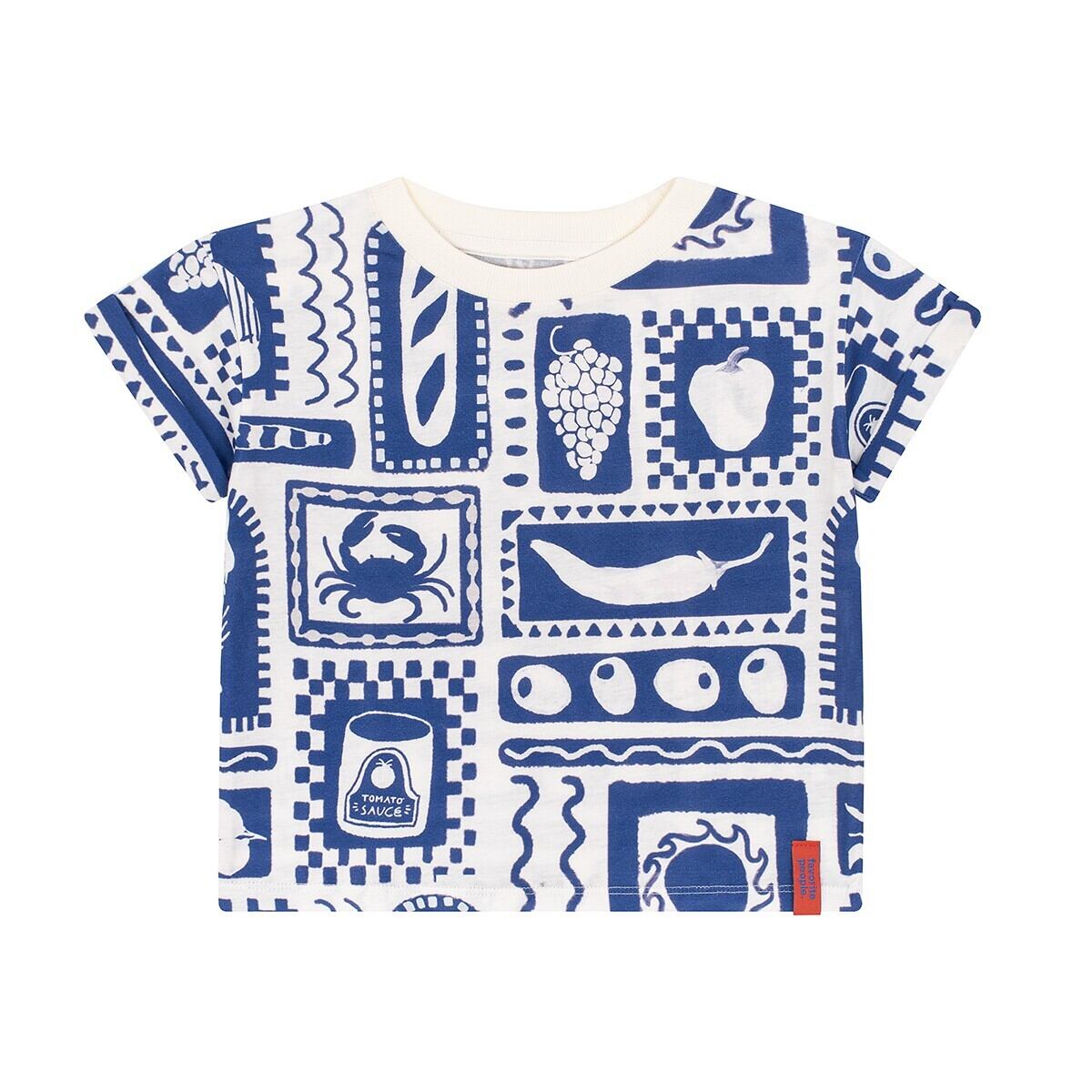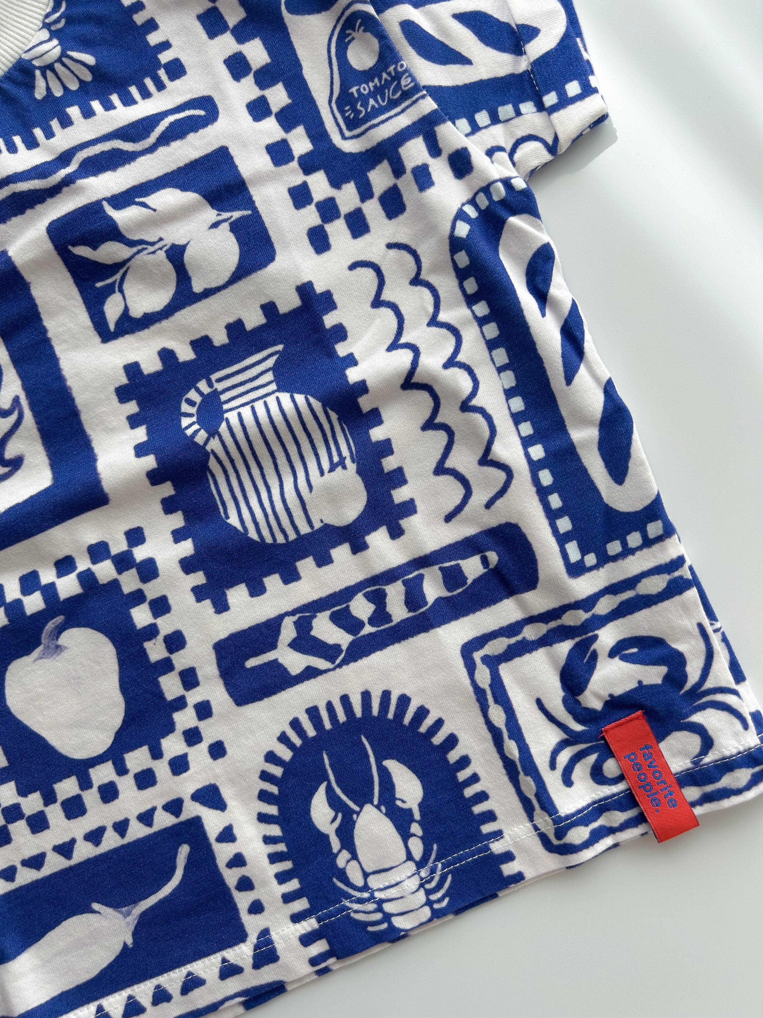食材モチーフを使いながら、Positanoをイメージした鮮やかなブルーのTシャツ。