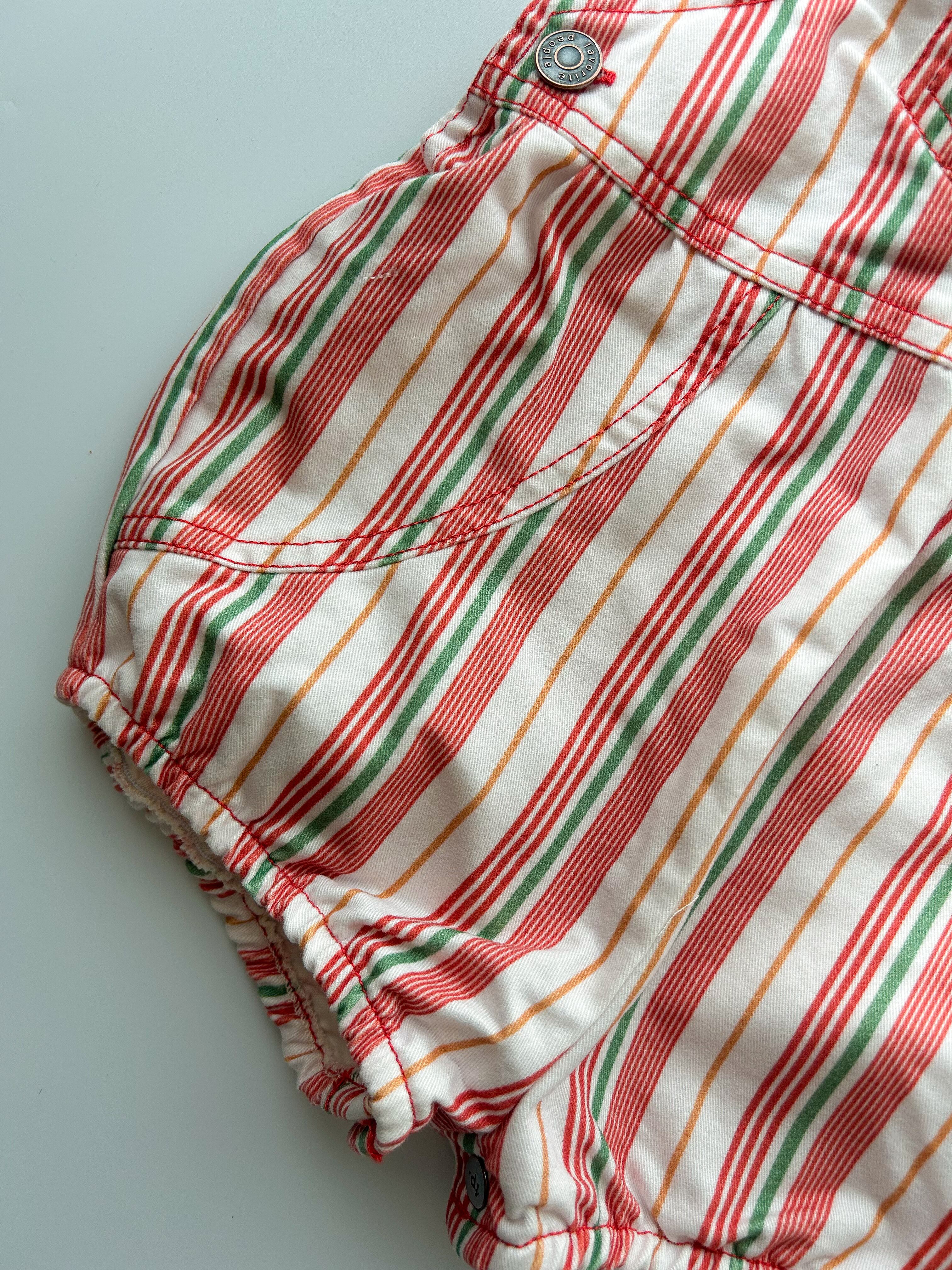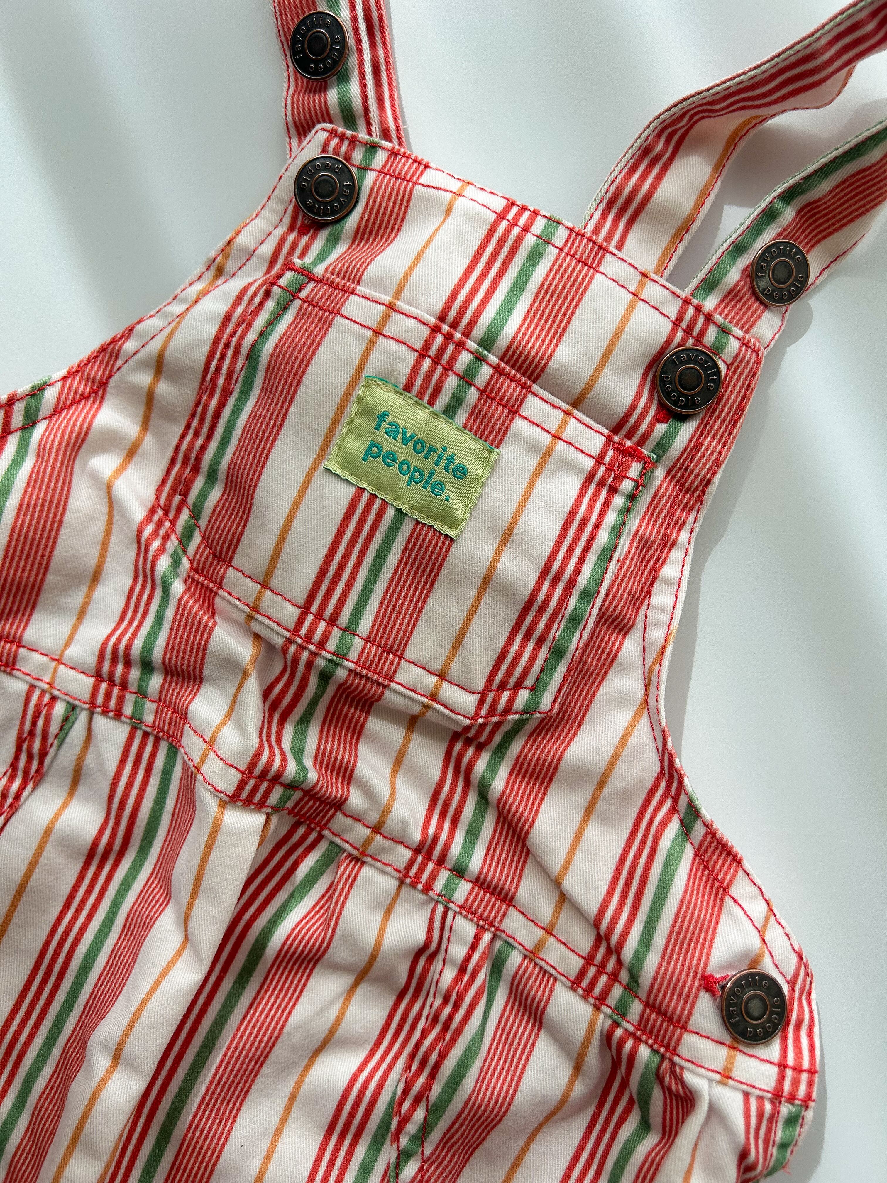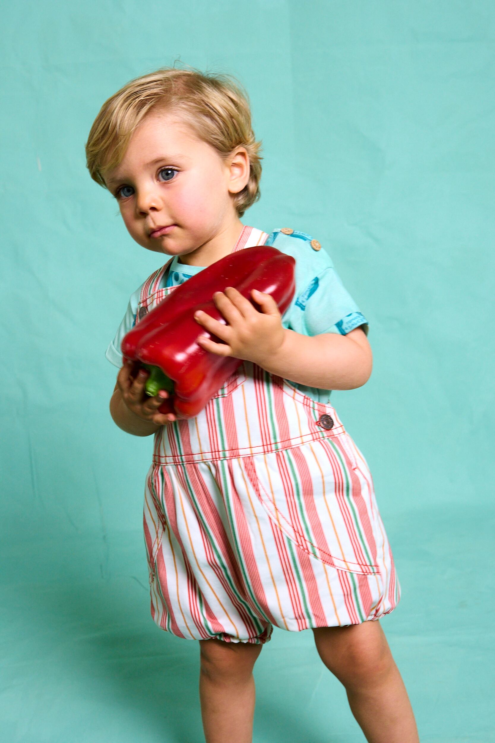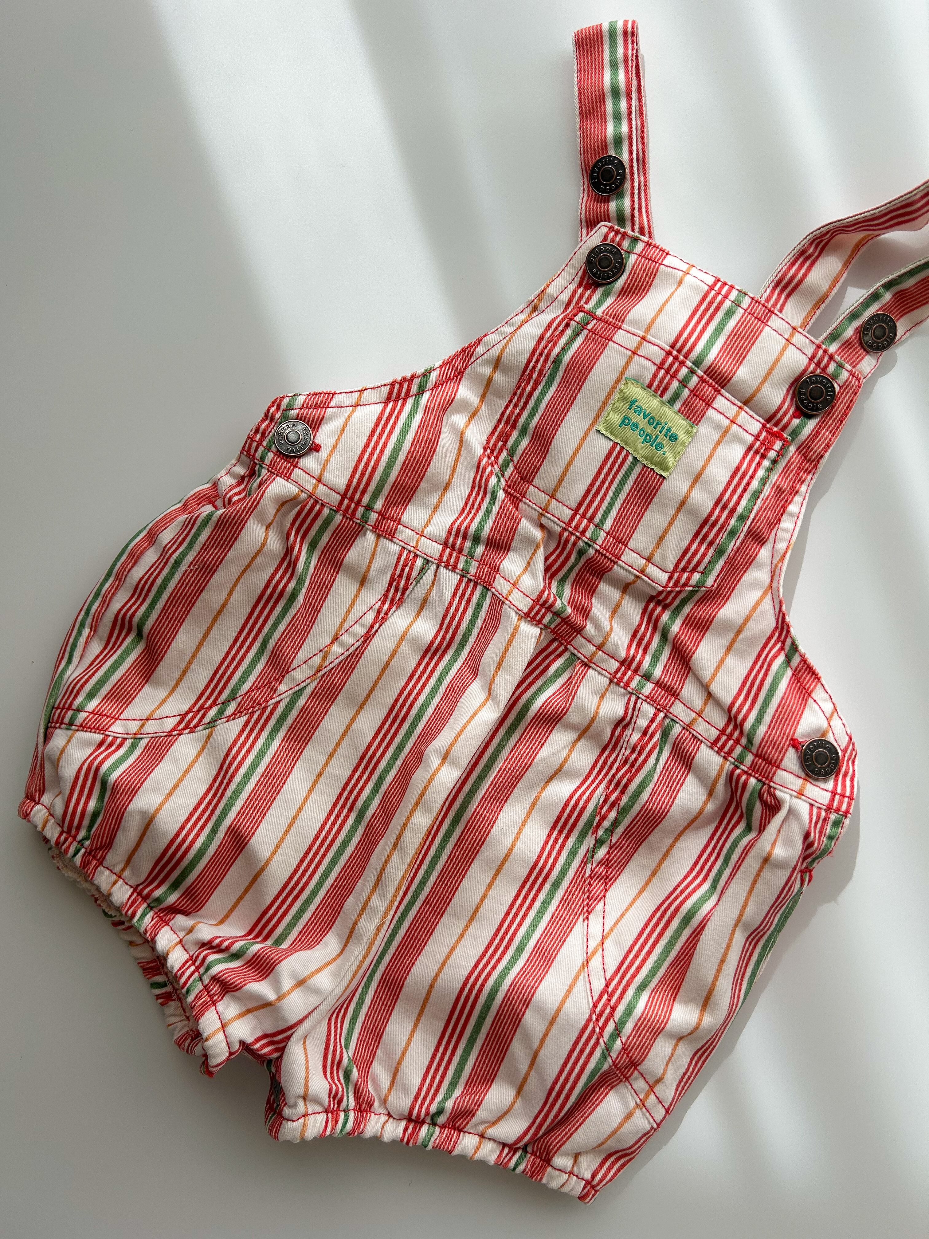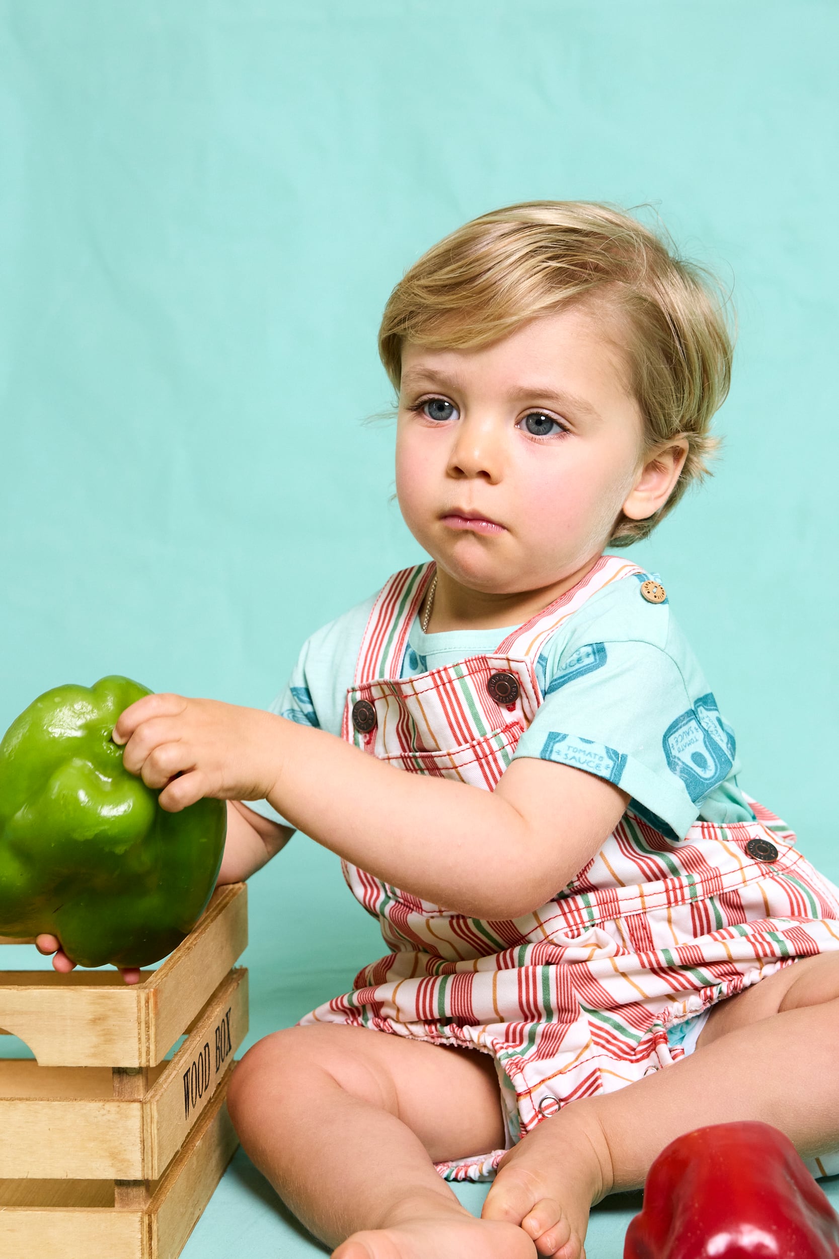 ラザニアをイメージしてデザインされたストライプ柄が可愛いデニムロンパース。