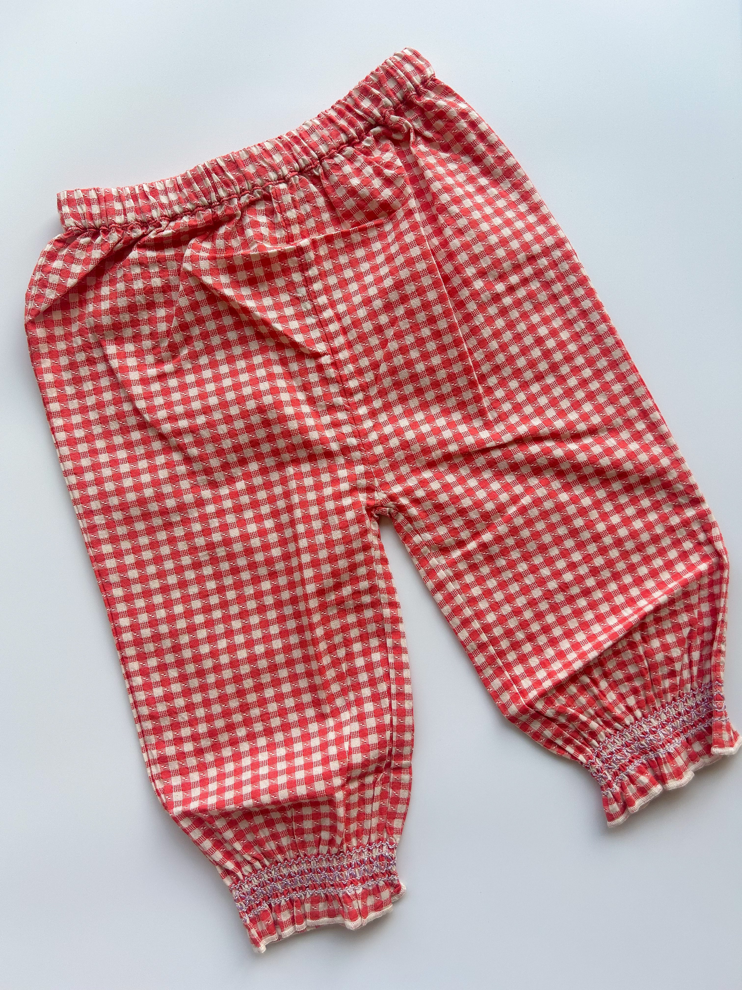 赤のギンガムチェックで軽やかな生地感が可愛らしいパンツ。