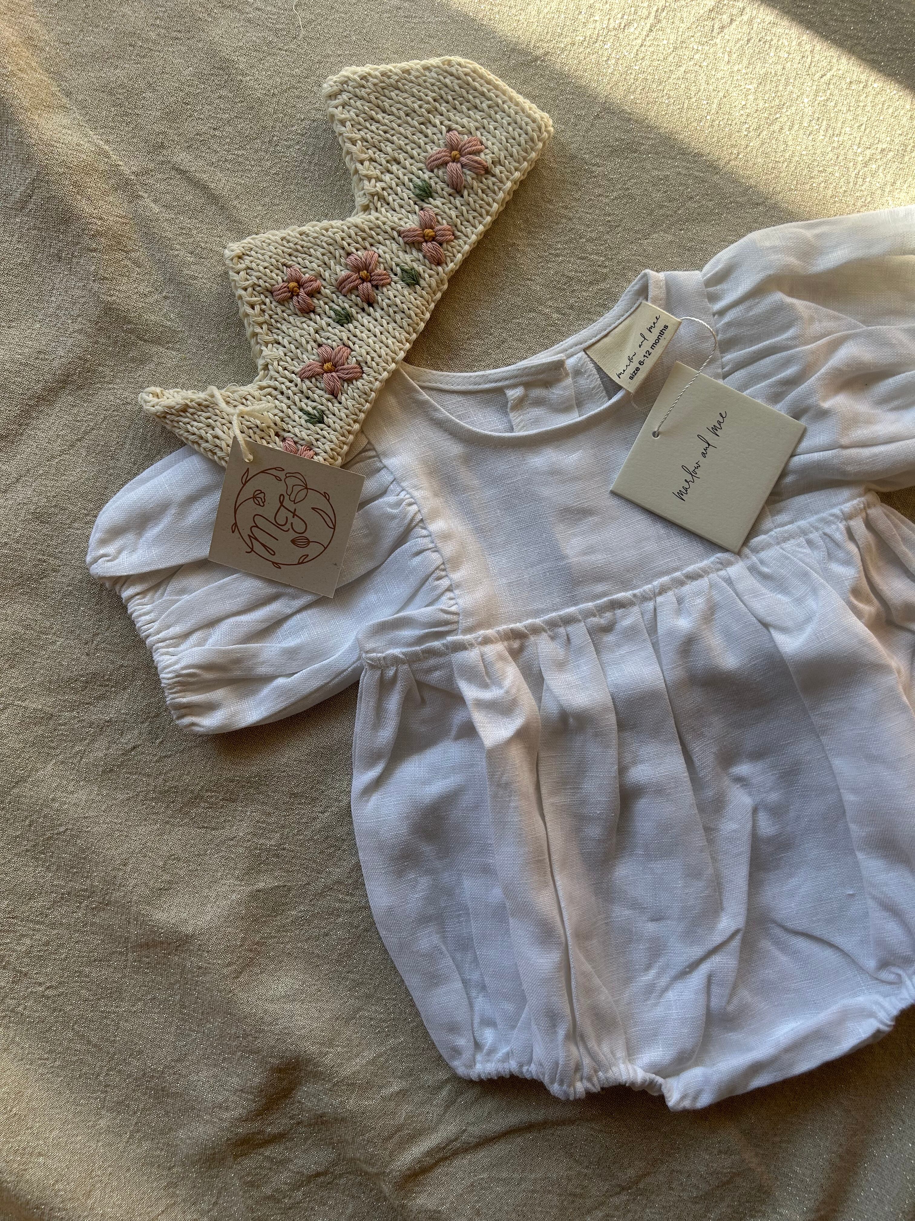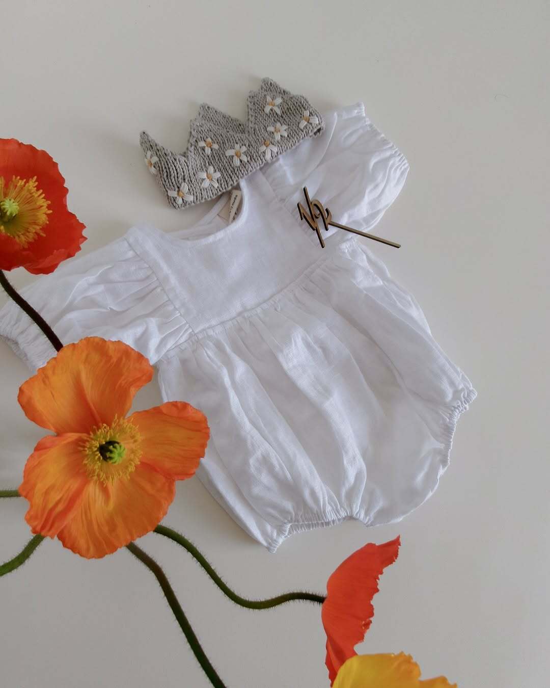 サンドウォッシュ加工を施したリネン100%のロンパース。